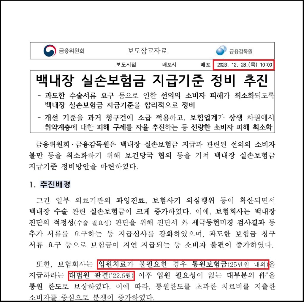 백내장 실손보험금 지급 기준 정비 추진에 대한 금감원의 보도참고자료